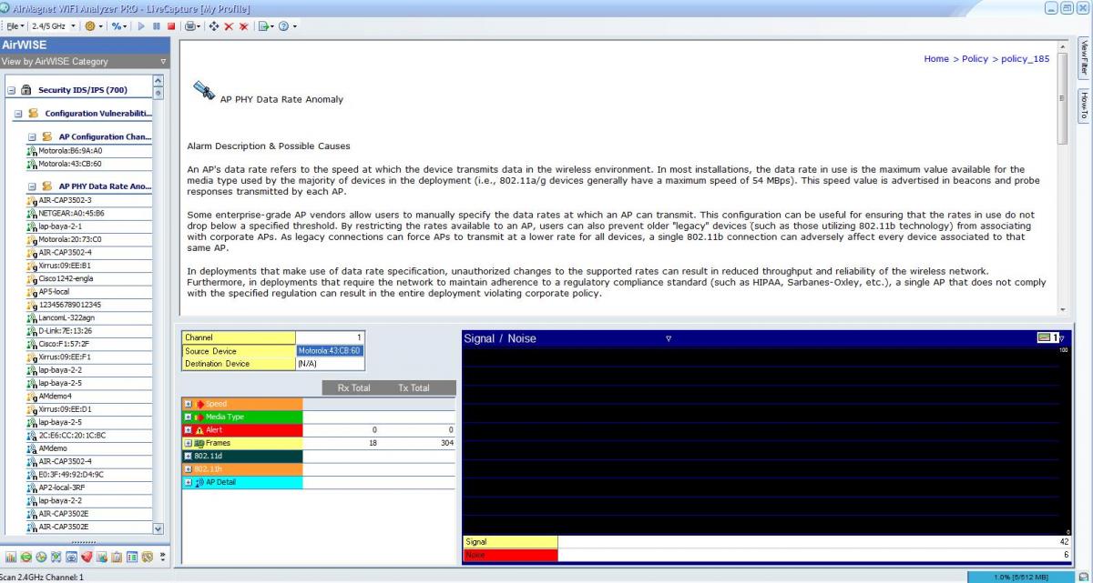 AirWISE® 引擎可自动检测整个频谱上数十种无线网络故障处理问题的根源。在对 Wi-Fi 网络带来影响之前,AirWISE® 能主动识别并解释数百种威胁和性能问题,用户现在无需手动解释复杂的数据包解码和无线数据。通过用户友好的 AirWISE® 界面,可为用户提供详细警报分析、额外的诊断数据和纠正措施的建议。
