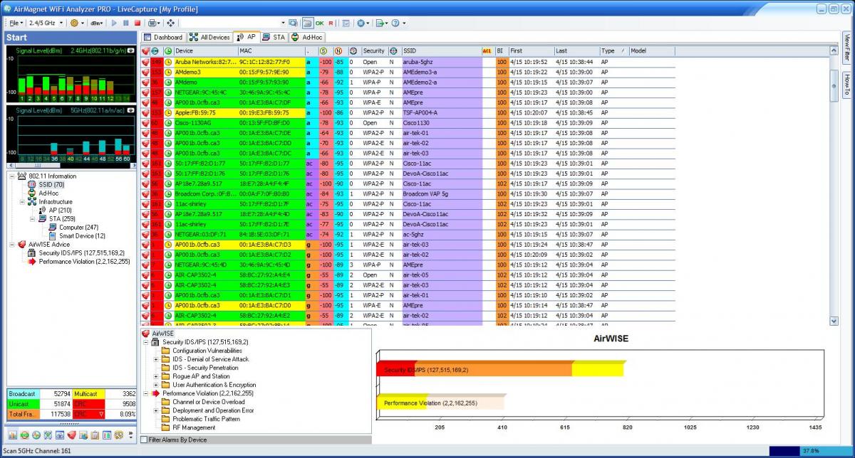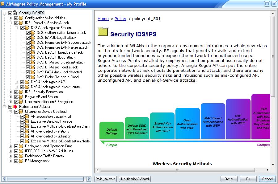 AirMagnet WiFi Analyzer 可自动检测数十种无线侵入、渗透尝试和 Wi-Fi 黑客攻击(包括恶意设备、 “过失工具”,发送未加密的数据的工具及许多可能带来危害的无线安全配置),并向用户发出提示。这些主动措施使得 IT 部门能够在问题发生之前采取纠正措施。AirMagnet WiFi Analyzer PRO 版还能检测出针对网络的复杂无线攻击。AirMagnet WiFi Analyzer 的发现工具能够锁定恶意的或违反规定的接入点或终端设备,并引导用户扎到它们的实际位置。