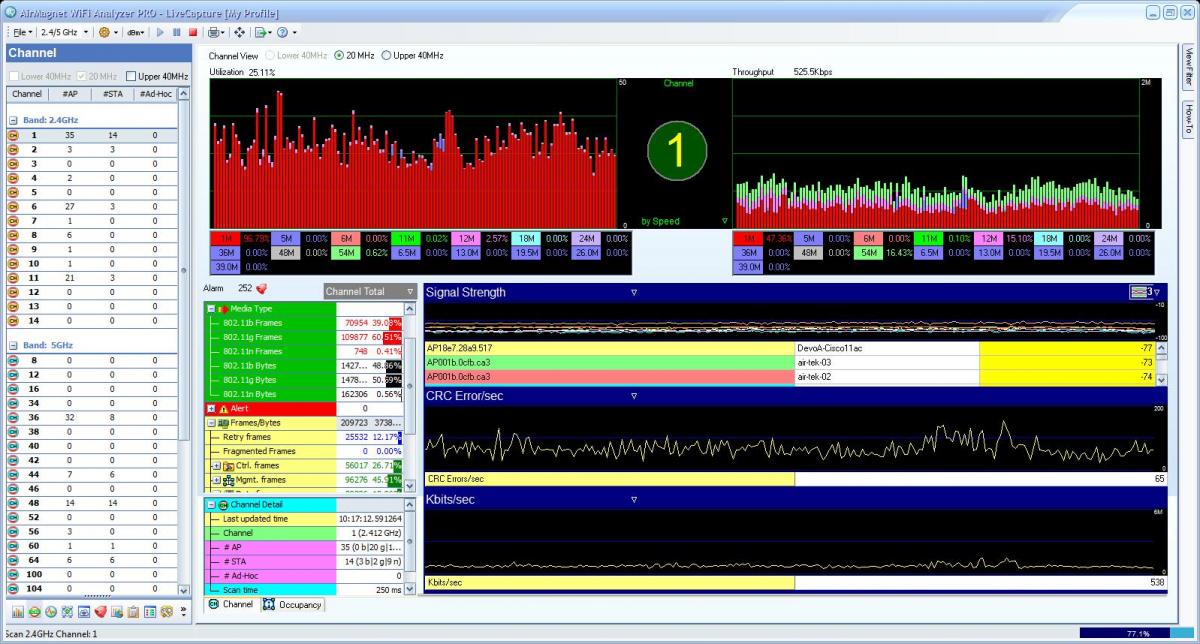 除通过 AirWISE 即时提供答案外,AirMagnet WiFi Analyzer 为在频谱中运行的每个信道和每个设备都提供了详细的帧统计。利用信道利用和吞吐量趋势图,用户可对很多降低无线网络整体性能的问题进行故障排除。AirMagnet WiFi Analyzer 用户可查看每条无线网络信道和每个设备的各种趋势图,如信号强度、噪声、帧、错误、重试,带宽等。这些重要的网络监控图表提供了关键信息,用于帮助用户对影响无线网络性能的问题进行问题排除。例如,数据包重试和错误率图能够告诉用户哪个区域的无线网络通信出现故障。在 AirMagnet WiFi Analyzer 的解码屏幕上,用户可以查看和分析实时的数据包列表,包括 3X3 802.11n 和 3X3 802.11ac 数据包,也包括监控上层协议的支持。AirMagnet WiFi Analyzer 为用户提供了应用过滤器的选择,如基于一个特定的信道、SSID、节点、IP 地址或帧类型,以隔离感兴趣的特定数据包。可解密 WPA-PSK 和 WPA2-PSK 加密的数据包。凭借着 AirMagnet WiFi Analyzer PRO 的多适配器支持,用户可将各个适配器与同一 PC 相连,从而实现同时监控多条信道的目的。