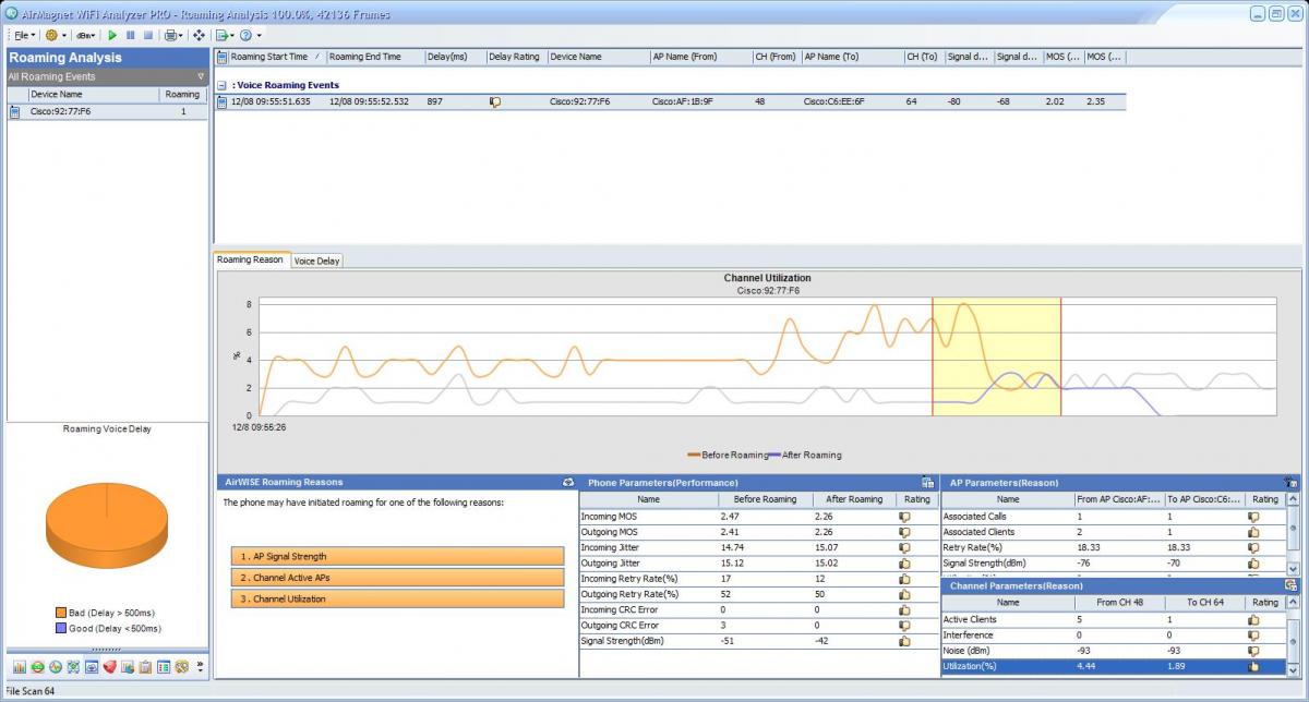 AirMagnet WiFi Analyzer 提供任何 WLAN 客户端(如终端设备、电话和手持式扫描仪)的所有漫游事务详情。用户将使用 AirWISE® 的专门技术,了解漫游事件发生的具体原因及影响漫游的设备和信道参数,并洞察漫游事件的好坏与否。