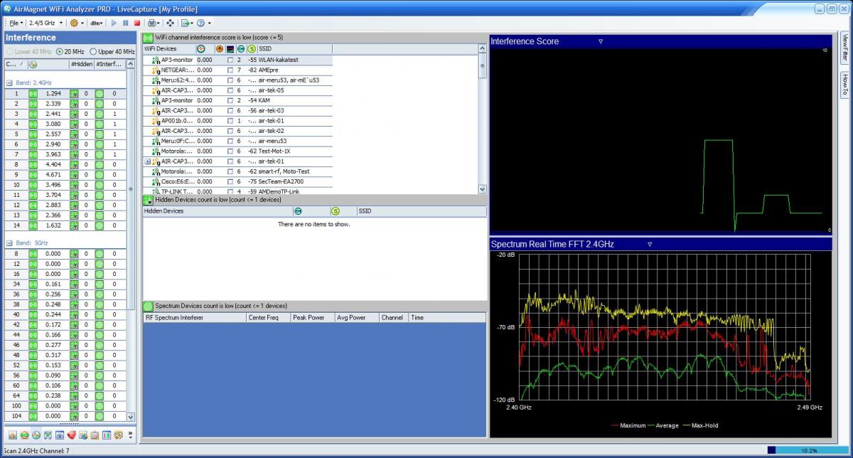 干扰是网络连接不稳定和性能问题的主要原因之一。干扰的发生可能是由于其他 Wi-Fi 设备不当的信道规划(同信道干扰或邻信道干扰)或者非 Wi-Fi 干扰源造成的。Wi-Fi 干涉的发生可能是由于和其他公司或周围 WLAN 存在同信道干扰和邻信道干扰,环中有暗藏的节点,或者 802.11 频带中有正在工作的非 Wi-Fi 设备。AirMagnet WiFi Analyzer 的干扰状态显示屏上将列出每个 Wi-Fi 信道的整体干扰状态(对造成干扰的设备,根据 Wi-Fi 干扰计算得分)还将列出信道中处于运行状态的隐藏节点和非 Wi-Fi 设备(非 Wi-Fi 检测要求计算机上同时装有 AirMagnet WiFi Analyzer Pro 和 RF 频率分析仪。这使得用户可以轻松规划将来的 Wi-Fi 部署,或修改现有部署来减少干扰并提高网络性能。