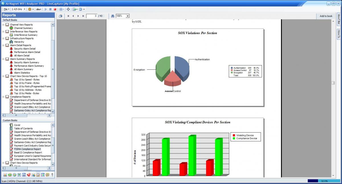 使用 AirMagnet WiFi Analyzer Pro 集成的报告器,您可以轻松地把 Wi-Fi 分析会话变成专业定制的 Wi-Fi 网络监控报告。您可以从用户界面选择预先建立好的报告,或者选择特定项目来生成目标报告。Wi-Fi 网络监控报告内容涵盖管理的各个方面,包括 RF 统计、渠道报告、设备报告、安全或者性能问题报告和各种法定标准(如 HIPAA、PCI、SOX、DoD 8100.2、FISMA 等)的合规性报告。对于合规性报告,我们可以引导您对标准的各个部分进行详细的通过/失败评估,其中包含各个设备是否合规的详细信息。