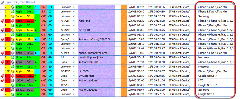 AirMagnet WiFi Analyzer PRO 立即检测和分类连接到网络的智能手机和平板电脑。此功能允许 IT 专业人士授权这些设备,快速进行排除故障并解决这些设备所造成的问题,以及确定它们对 WLAN 网络造成的性能和安全性影响。例如,用户可以非常快速地发现连接至网络的恶意智能设备,然后通过访问仪表板上的会话设备图形确定特定的智能设备是否占用了大量的带宽。