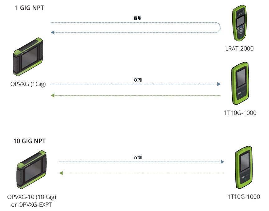 我们举例来说明如何验证数据中心中的 10G 链路。首先,所测网络两端必须各连接一台 OptiView XG。这是为了保证两端的测试点都能以 10Gbps 的速率发送和接收,以及保证硬件能够处理测试的时间和流量特征。