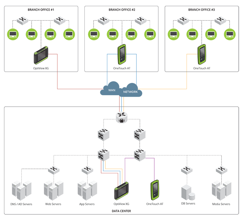 NPT 功能还支持多终端模式,可同时进行八个性能测试。可在网络中分散的位置连接 LinkRunner AT 或 OneTouch AT 形式的远程终端以在一次测试中验证多个关键网络路径。这样可测量关键通路的吞吐量、抖动、丢包和整体性能。测试发现问题后,可以快速运行 OptiView 直观的路径分析功能,以检测影响性能的根本网络问题。